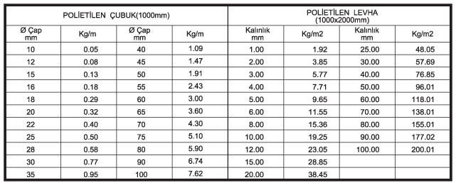 - POLİETİLEN MAMÜLLERİ ( Özgül Ağırlık: 1 )